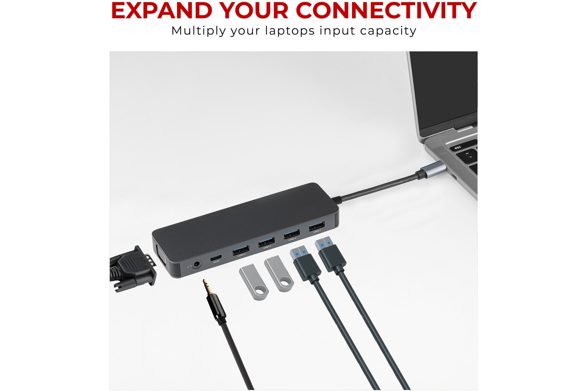 Expand the connectivity of your MacBook Pro, Chromebook or other USB-C enabled laptop. The Nikkai USB-C Multiport Hub to 2x USB-C / 4x USB-A / 2x HDMI / Gigabit RJ45 / VGA / SD / Aux lets you use two 4K Ultra HD HDMI video output, three USB 3.0 Type-A ports, a USB 2.0 Type-A port, a Gigabit Ethernet port, a Full HD VGA port, a PD charging USB-C port and a data transfer USB-C port plus a SD and MicroSD card reader slot and 3.5mm Aux Audio port all through your laptop’s USB-C port.