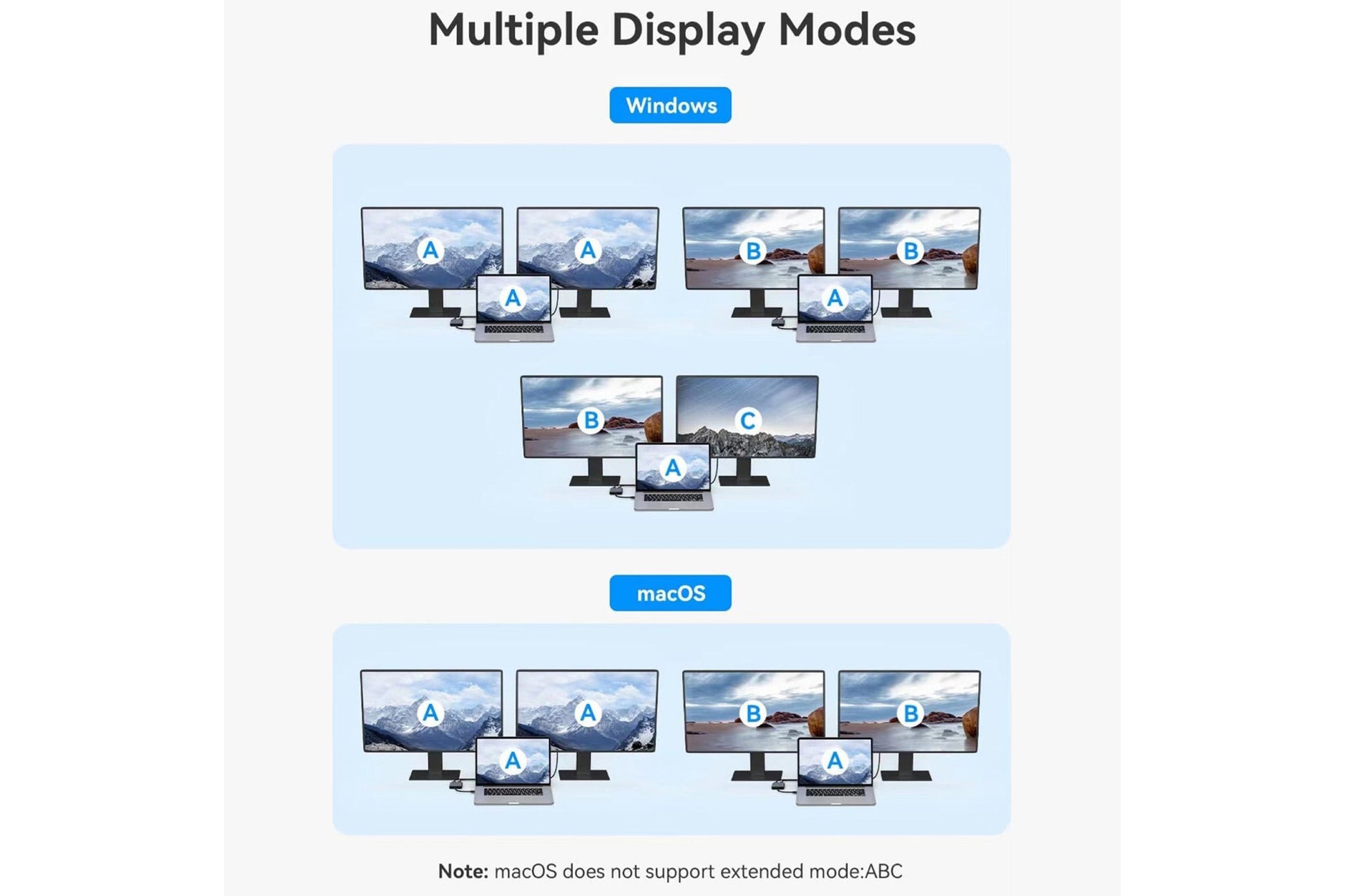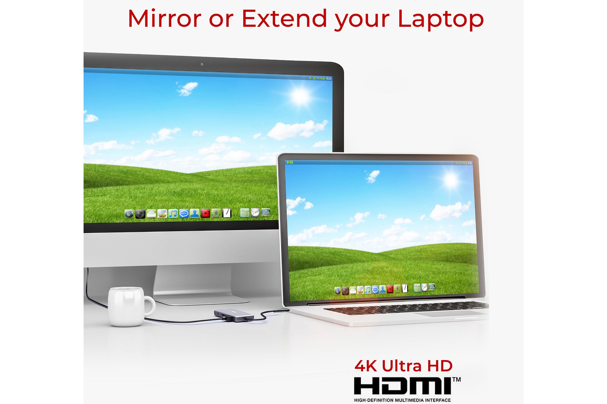 Using the 4K 30Hz HDMI ports, you can easily connect a high-resolution monitor and gain access to more screen space. You can also use the VGA port to connect to an extra monitor. It is 1080P compatible at 60Hz. The adapter supports Mirror, Extend and Split mode on monitors. Both SST (Single Stream Transport Mode) and MST (Multi-Stream Transport) modes are supported so multiple monitors can be used, as extra display space or to show the same view on an additional screen. VGA and HDMI can be displayed at the same time.